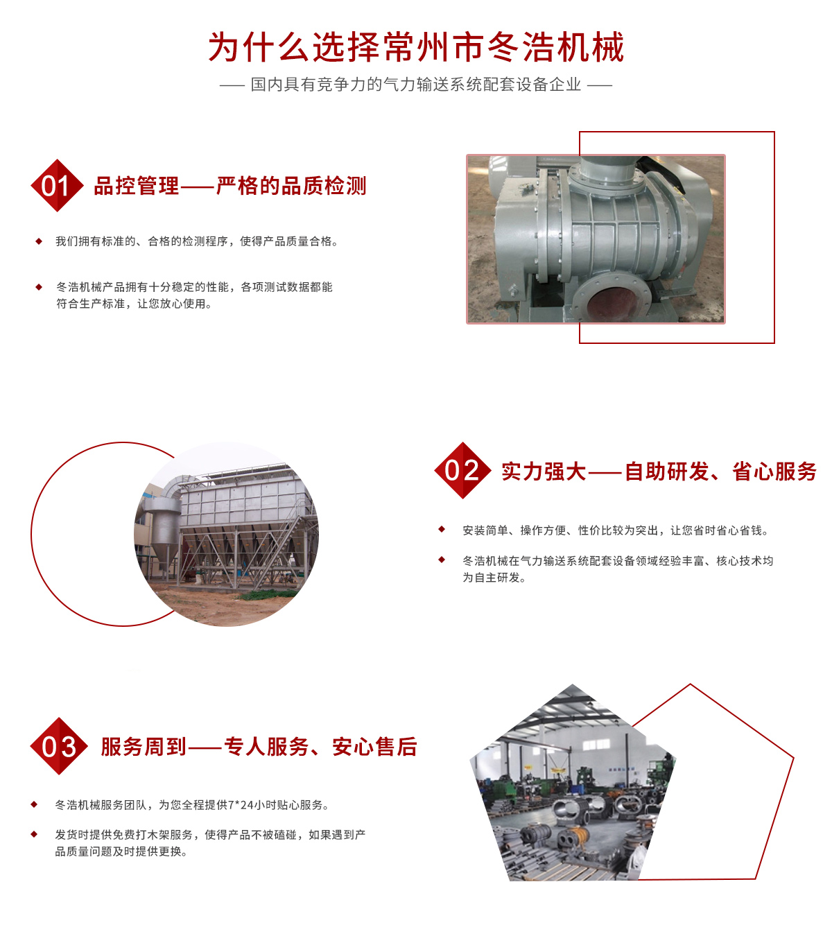常州市冬浩機械有限公司占地面積5000平方米,擁有一支專業的科技研發團隊和配備專業的生產設備。專業致力于氣力輸送系統配套設備的研發、生產及銷售。產品在實際應用中不斷創新、不斷升級,現已對接實現自動化、智能化、人性化。實踐證明公司生產的吸糧機系列、高溫羅茨風機系列、關風機系列、氣力輸送設備系列、特殊工況訂制系列的產品被廣泛運用于石油化工、油脂、化工干燥、除塵、冶金、環保、電子、煤炭、建筑、電力機械、糧食、飼料等行業。為解決輸送、搬運等環節中節約大量的人力、財力;從而提高了生產效率。